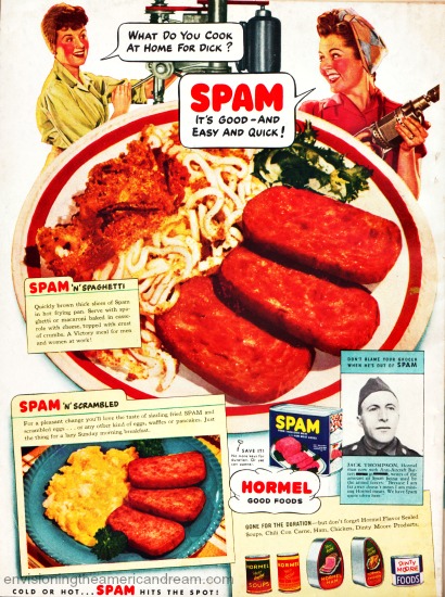 Even if she was lucky to have a husband at home women ended up carrying nearly all the care-giving responsibility. When Rosie returned each day from the great army of women soldiers of production she became a soldier of the kitchen. Vintage ad Spam 1943