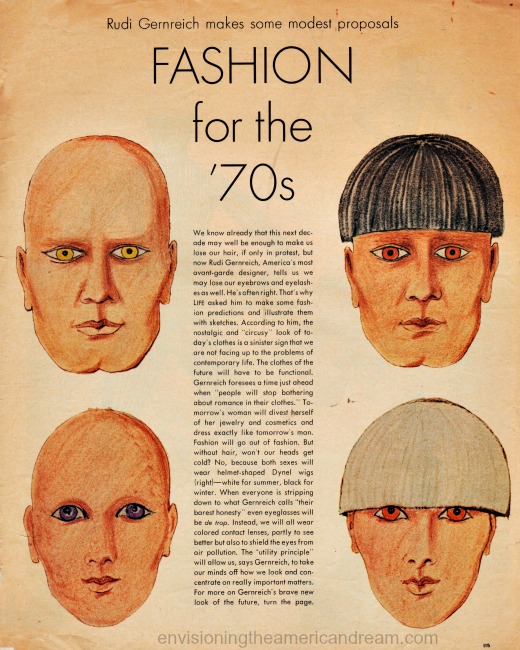 “We know already that this next decade may well be enough to make us lose our hair, if only in protest, but now Rudi Gernreich, America’s most avant-garde designer, tells us we may lose our eyebrows and eyelashes as well,” begins the Life magazine article.