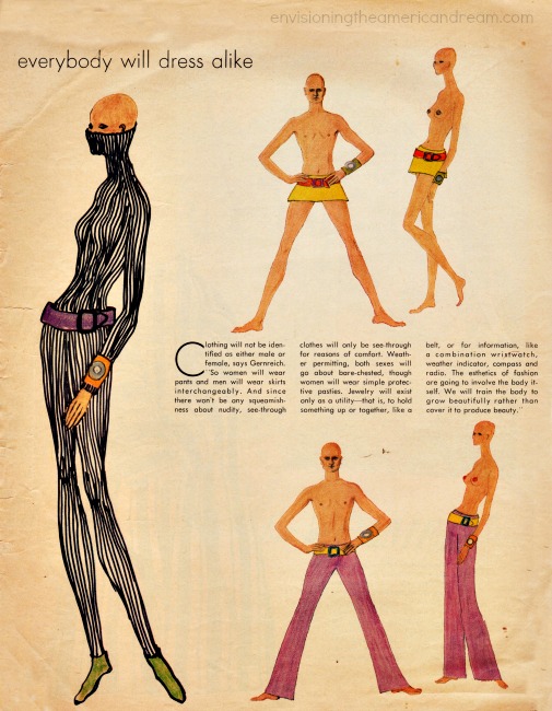 “Weather permitting both sexes will go about bare chested, though women will wear simple protective pasties. Jewelry will exist only as a utility- that is, to hold something up or together, like a belt, or for information, like a combination wristwatch weather indicator, compass and radio.”