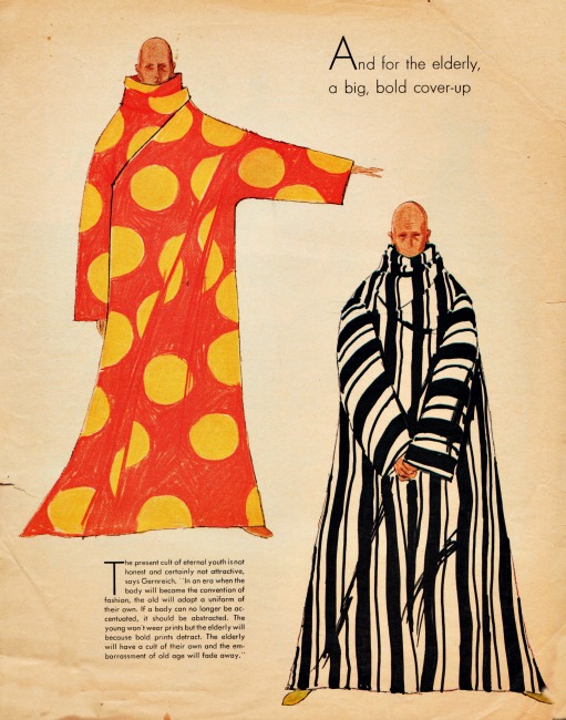 “In an era when the body will become the convention of fashion, the old will adopt a uniform of their own. If a body can no longer be accentuated, it should be abstracted. The young won’t wear prints but the elderly will because bold prints detract.”