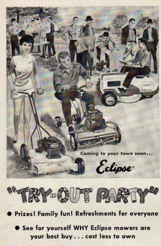 The Eclipse Lawn Mower targeted the lady of the house in one ad : “Mrs. Home Owner will appreciate the easy handling, free rolling and distinctive styling of your new Eclipse as much as the man in the family goes for it its exclusive mechanical features and trouble-free maintenance.”