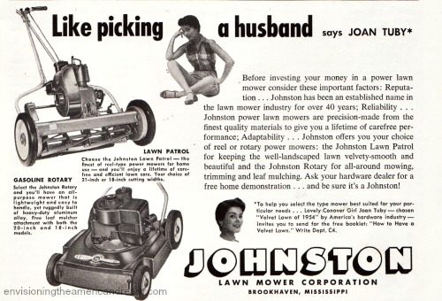 “Lovely Conover Girl Joan Tuby” coyly appealed to the ladies that choosing a lawn mower was “Like picking a Husband.” Wearing short shorts and a halter top, the vivacious model also appealed to the gents.