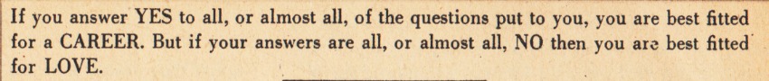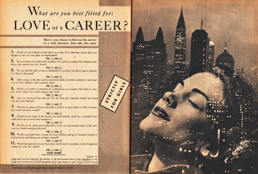 The May issue of The Girl Friend ( and The Boy Friend ) a pulp magazine, had offered 2 gender specific tests for its readers in 1953. The quiz, strictly for girls, asked the question “What are Your Best Fitted for: Love or Career.”