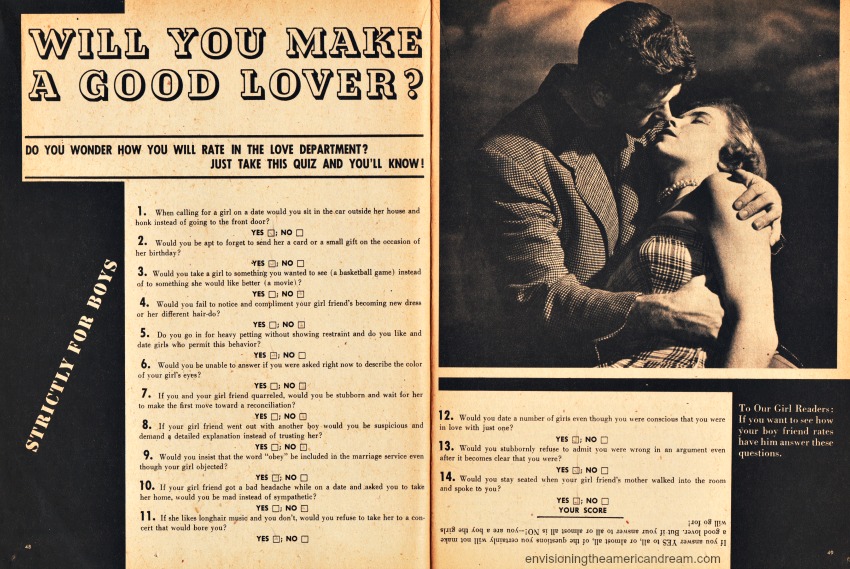 Turning the page of the magazine was another quiz this one strictly for the male species, but was directed to their “girl readers” : “If you want to see how your boy friend rates have him answer these questions!”