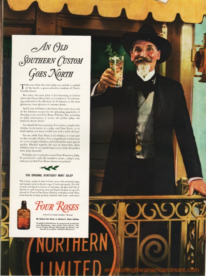 Toasting the Old South’s contribution to good taste may not seem to be in good taste today, but the depiction of the southern hospitality of a plantation owner admired in this ad, ran the same year the Confederate flag was adopted by the Dixiecrats, the segregationists that formed to oppose the civil rights platform of the Democratic party that called for racial integration and reversal of Jim Crow laws.