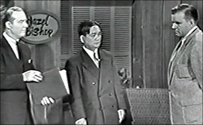 Returning from a commercial from their sponsor Hazel Bishop makers of long lasting nail polish, a loud disembodied voice was heard offstage: