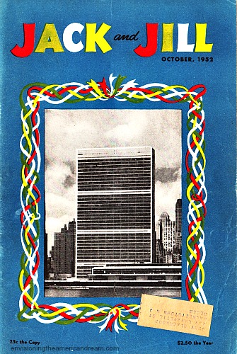 Vintage children’s magazine celebrating the birthday of the new UN building October 1952. The United Nations was originally located in Lake Success, N.Y. until Mrs. John D. Rockefeller donated some land along the East River in NYC to serve as permanent headquarters. By 1952 the UN settled into its permanent home.s.
