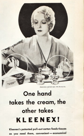 In 1925 the first Kleenex tissue ad appeared in a magazine showing “the new secret of a pretty skin as used by famous movie stars.”
