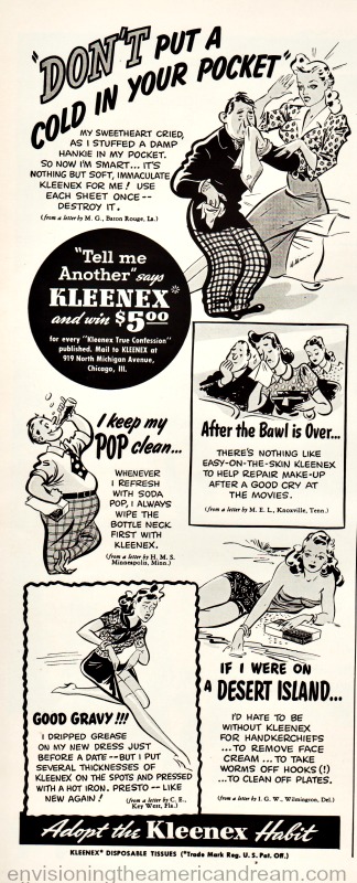 “Now I’m streamlined,” boasted one young modern. “Carrying four or five hankies in my pocket during colds made my figure bumpy in the wrong places! Now I carry Kleenex and I’m in good shape again!”