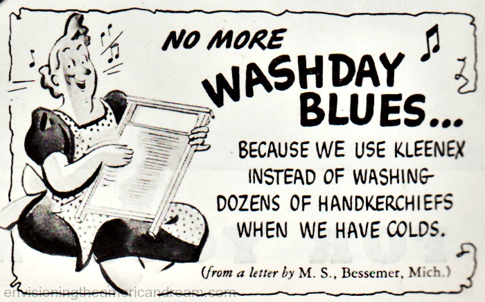 When Kleenex was first introduced they pointed out that they were economical too. Not only it was more hygienic they costs less than laundering handkerchiefs! “Kleenex is a great saving if you have your wash done