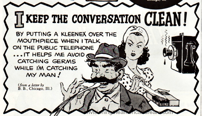 “Kleenex is so much more sanitary,” the ad emphasized. “You use it just once then discard it. Cold germs are discarded too instead of being carried about in an unsanitary handkerchief to reinfect the user and infect others.”
