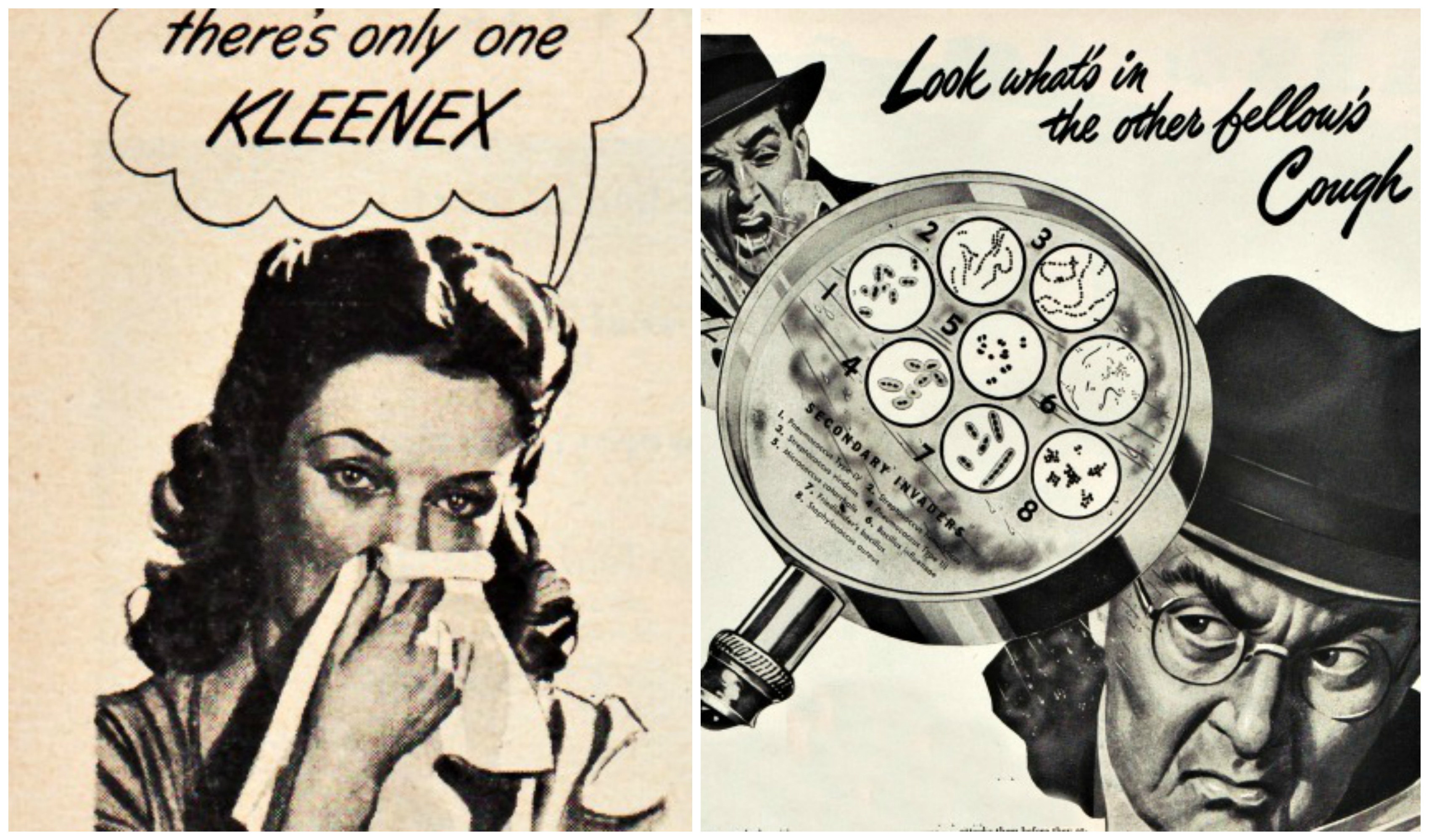 “Germs slip through the tightest weave of linen or cotton handkerchief as though through a sieve, contaminating everything you touch,” warned Kleenex ominously. “And its damp rough handkerchiefs that add so much to the misery of a cold by constant irritation.”