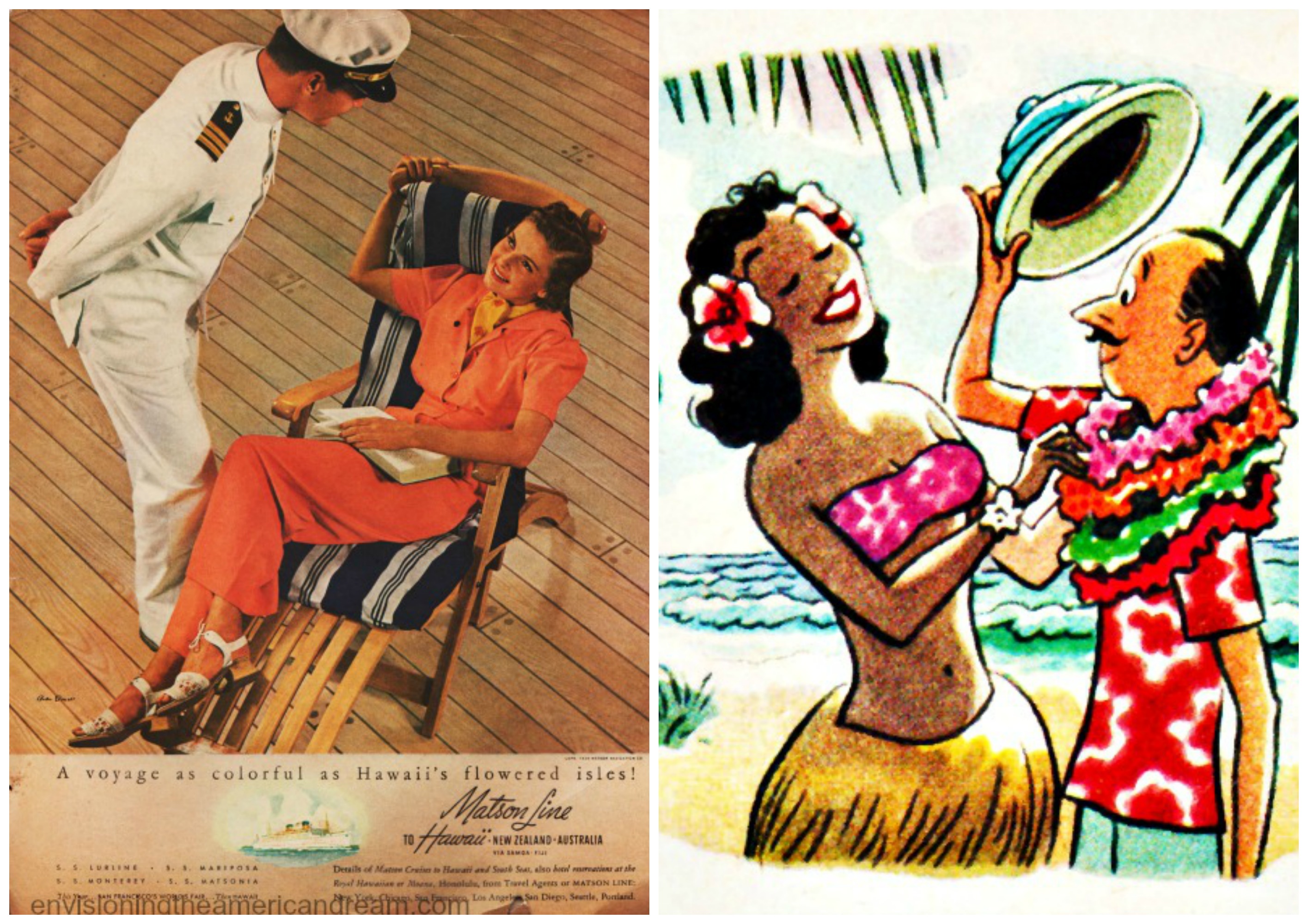 (L) 1939 Vintage advertisement- Matson Cruise Line to Hawaii “A Voyage as Colorful as Hawaii’s flowered isles”