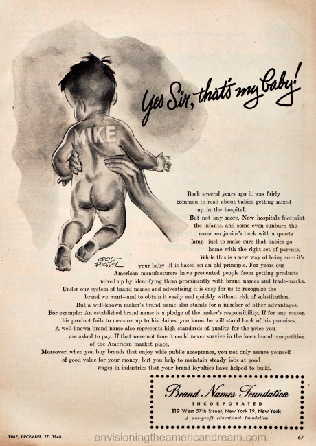 “For years out our American manufacturers have prevented people from getting products mixed up by identifying them prominently with brand names and trademarks. Under our system of brand names and advertising it’s easy to recognize the brand we want without risk of substitution.” Vintage ad 1948 Brand names Foundation