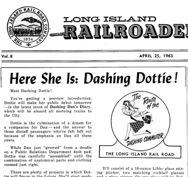 The magazine to introduce Dottie to Long Island Railroad employees before her big debut the next day to all commuters. Vintage Long Island Railroader April 1963. Archive Dave Morrision courtesy http://www.trainsarefun.com/lirr/lirrlogos.htm