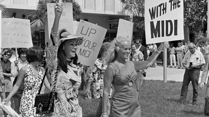 Mini-skirted women march in protest of the midi skirt, July 13, 1970, in Miami, Fla. The women are afraid stores will stop stocking the mini skirt and they want freedom of choice in their attire. (AP Photo/Jim Kerlin)