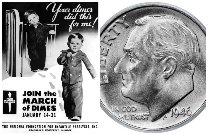 Franklin Roosevelt founded the National Foundation of Infantile Paralysis in 1938 to combat polio. The name March of Dimes was coined by comedian Eddie Cantor as a nod to the famous newsreels “The March of Time.” He urged the public to send dimes to the White House and thousands mailed cards and letters each containing a dime. A redesign of the dime was chosen in Roosevelt’s honor after his death. The Roosevelt dime issued in 1946 on would have been FDR’s 64 birthday.My Mother was a veteran of that war and would play her part against polio, supporting the March of Dimes, the grassroots fundraising campaign used by the National Foundation for Infantile paralysis.