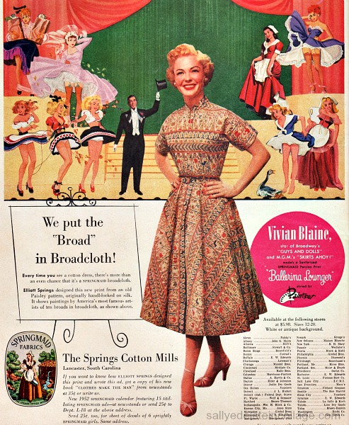 Vintage Springmaid fabrics Ad 1952 We Put the “Broad” in Broadside featuring actress Vivian Blaine star of Broadways “Guys & Dolls” and MGM’s “Skirts Ahoy”
