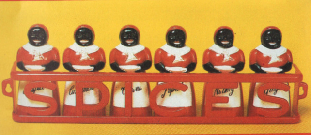 Fruit labels of smiling boys holding watermelons twice their size saying “Sho am Sweet,” Ceramic salt and pepper shakers molded in the form of little naked black boys sitting on toilets. Racist signs for Coon Chicken Inn shared space with chalkware plaques of watermelon-eating, grinning little black boys with kinky hair.