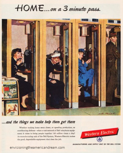 An outdoor public place of semi-privacy where wires magically connect people to a wider world. Vintage ad 1956