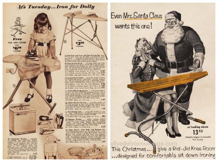 (L) Christmas toy wishlist from Wards 1959 (R) Vintage ad Ironing Board for Christmas