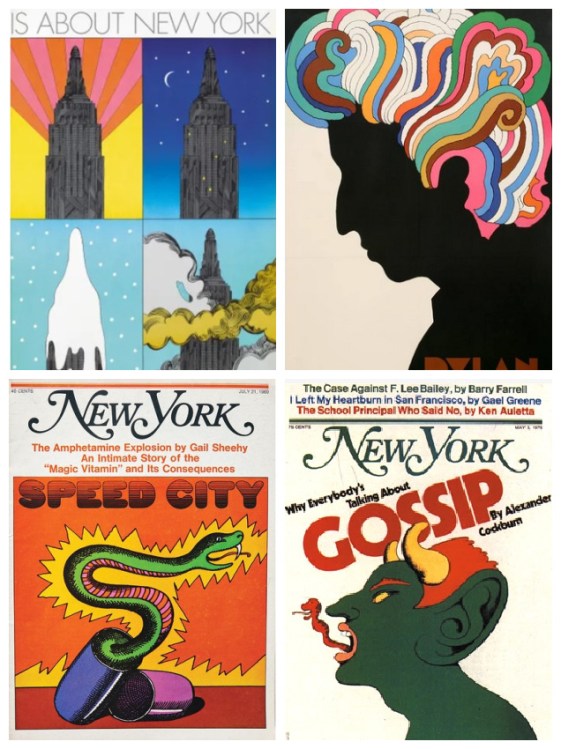Before the iconic 3 letters and a red heart slogan he created, Glaser designed the iconic 1966 poster for Bob Dylan in 1966 that enduring symbol that hung in every baby boomer’s bedroom. Glaser loved NYC and helped found “New York” Magazine where he created many covers. Top Left is the Glaser poster teeing up the launch of “New York” Magazine in 1967