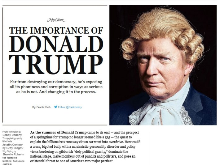 When Frank Rich wrote a glowing piece in September 2015 entitled “The Importance of Donald Trump” for New York Magazine, the apprentice politician and boorish businessman was seen as a disruptor, but not a viable candidate for President.