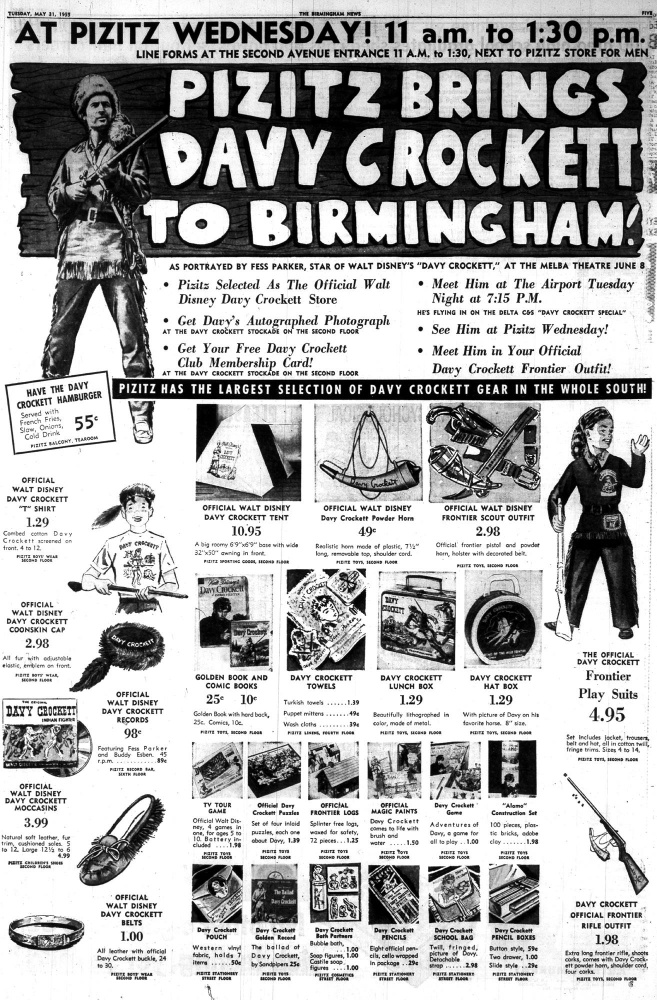 “Ever since February U.S. youngsters have swooped down on U.S. stores like marauding Indians, snapping up everything in sight that faintly resembles what Davy Crockett wore. To U.S. retailers, there has been no kiddie craze to match it since Hopalong Cassidy clattered into the corral five years ago. Sales of Davy Crockett coonskin caps, blue jeans, cap pistols, lunch boxes and dozens of other items, have already reached an estimated $100 million.”