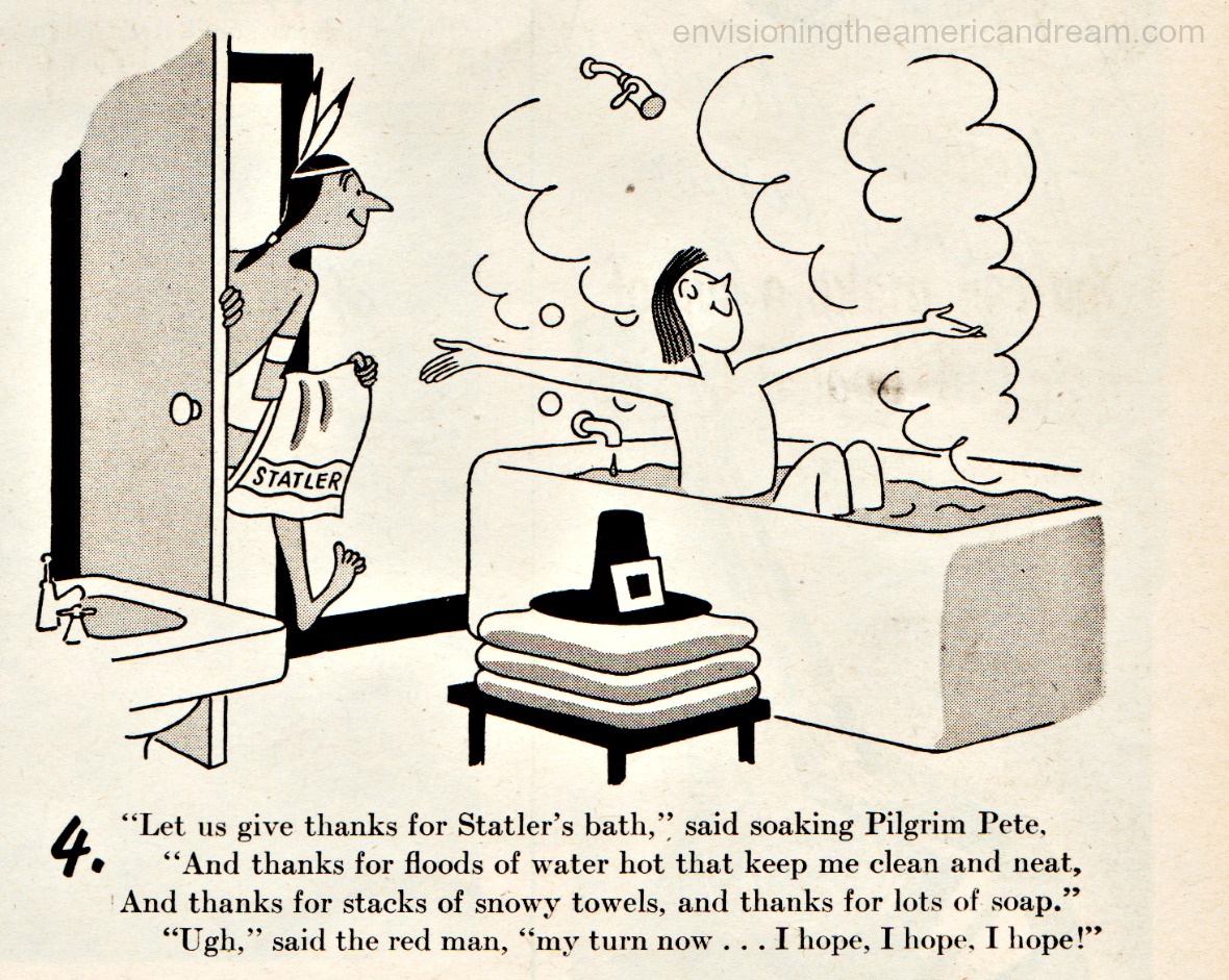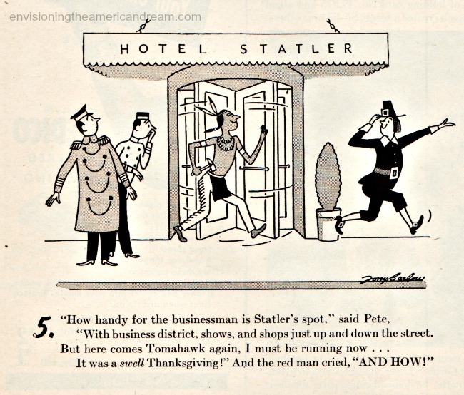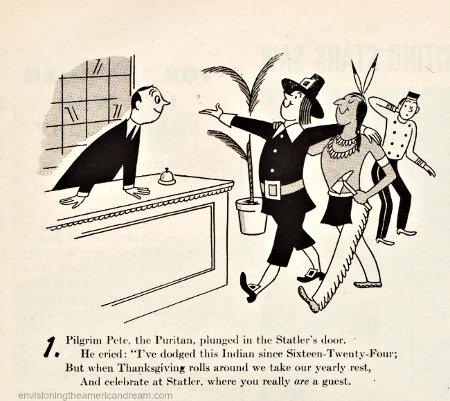 In this post-war ad for Statler Hotels, we are introduced to Pilgrim Pete and his tomahawk-wielding pal.