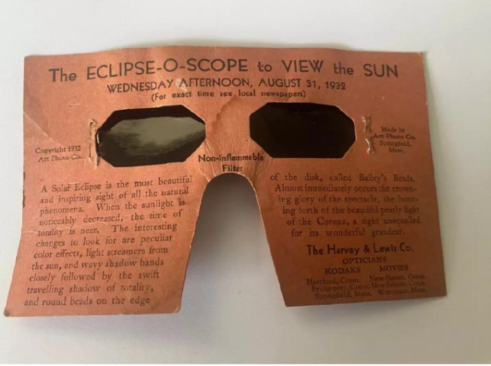Her very own “Eclipse-O-Scope” that she used as a 6 six year to view the Total Solar Eclipse of August 31, 1932. Her family had driven to Vermont that summer for the occasion, armed with the hi-tech glasses made by Kodak. These cardboard stock frames with “lenses” of darkened celluloid were made for safe viewing.
