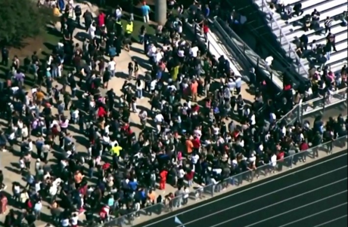 Students and staff gather next to the football field after law enforcement officers responded to a fatal shooting at Apalachee High School in a still image from aerial video in Winder, Georgia, U.S. September 4, 2024. (credit: ABC Affiliate WSB via REUTERS)