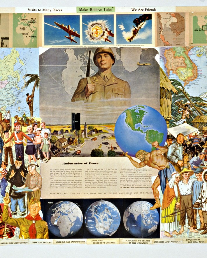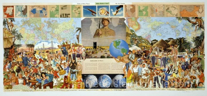 The large hand-cut collage serves as a visual history lesson. It invites the viewer to understand the historical context of America’s over-sized role in the world. Forged during the Post War years, we accepted our banner as leaders of the free world with pride, purpose, and commitment.