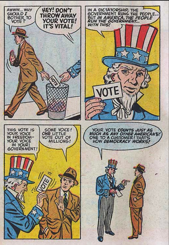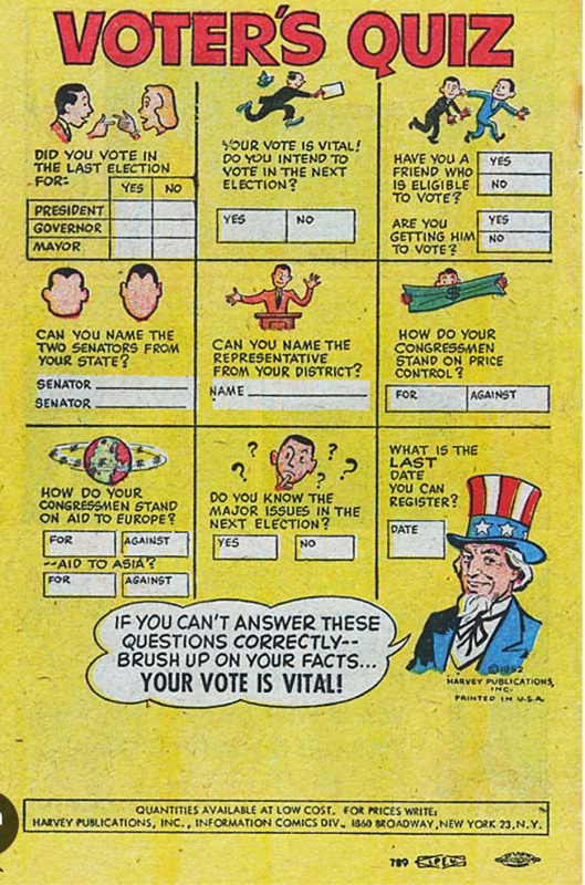 In 1952, Harvey Comics offered a public service guide for mid-century Americans on the importance of voting. This 16-page U.S. Government giveaway was distributed to encourage citizens to exercise their right to vote.