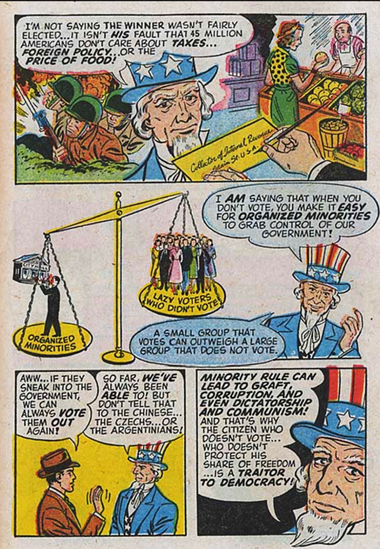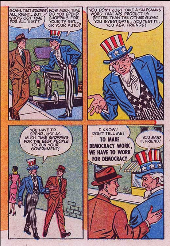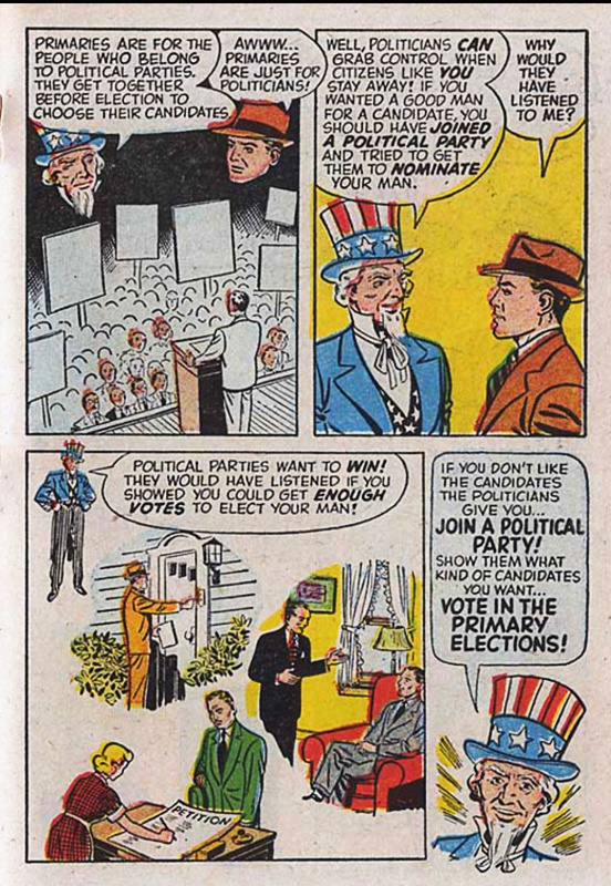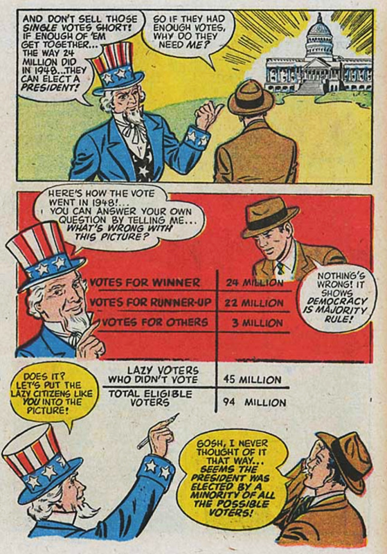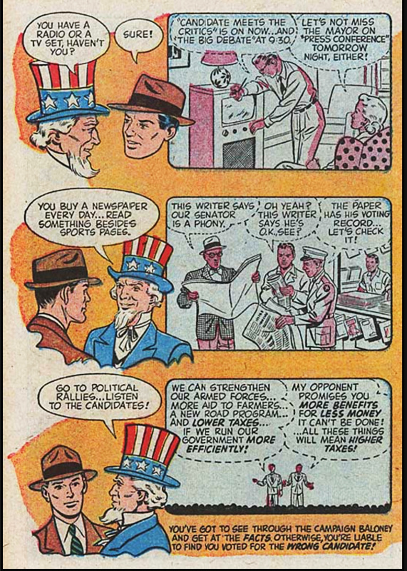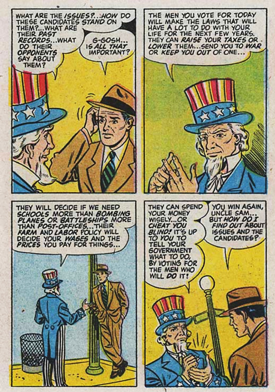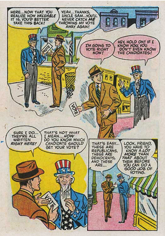 Illustrated by Al Avison the comic outlines how to vote, register, and pick a candidate.
