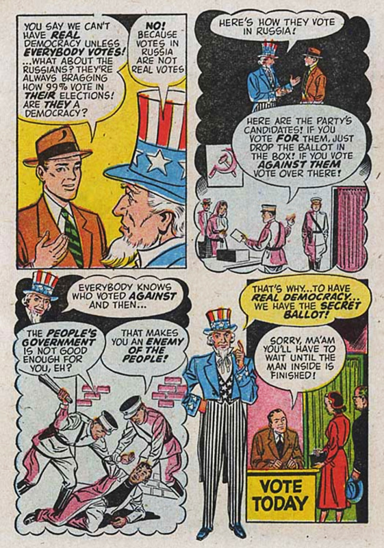 America’s free elections by secret ballot are contrasted with the Communist Soviet Union elections, in which voters are punished for voting against the party