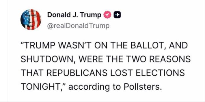 Okay. Good. Trump won’t be on the midterm ballot either, and voters won’t forget that the shutdown – during which many lost wages and many lost jobs – was caused by President Donald Trump’s machinations to deny healthcare to 30 million Americans while cutting taxes for his rich friends, pardoning crypto crooks, murdering Venezuelans, bailing out Argentina and building a hideous ballroom.