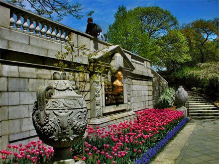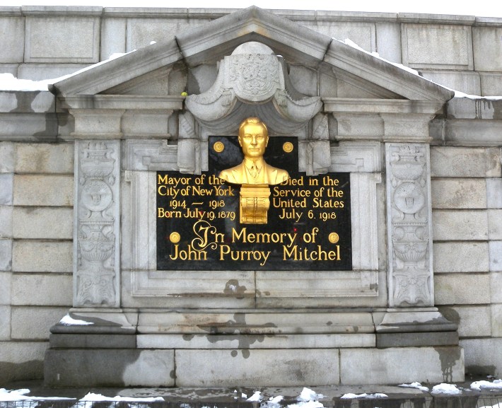 On Fifth Avenue and 90th Street, we would always stop at a prominent, gilt monument at the stairway leading to the reservoir. A memorial to John Purroy Mitchel. This oversize gilded bronze bust over granite of the one-term mayor was dedicated in 1928.