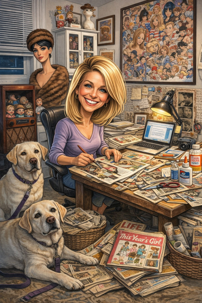 “I can generate a portrait of you in your signature Sally Edelstein collage/assemblage style — layered vintage ephemera, cut-paper textures, nostalgic objects, and a playful, story-packed composition.”