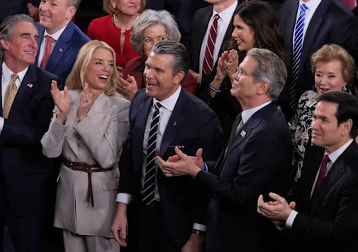 As excruciating and offensive as it was to watch and listen to a performative Trump ramble on lie after lie, appearing at times as tired and shop worn as his usual litany of complaints, it was the ghoulish sight of the go-team-go grinning of JD Vance and Mike Johnson sitting behind him that got to me.