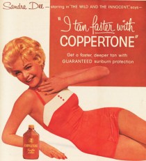 Nothing gave off the glow of good All American health than a deep dark tan, and mid-century teens competed for the fastest tan in the west. After all, our handsome, vigorous young President sported a glamorous tan and who in